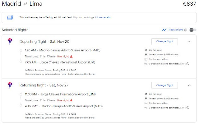 Nice fare for travel from Madrid, Spain to Lima, Peru with LATAM.
